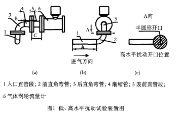 高水平扰动试验装置与低水平扰动试验装置总体管路结构相同,不同的是,高水平扰动试验装置在低水平扰动试验装置结构中的两个直角弯管之间加了半圆形开口结构的垫片,即使该处的流通面积为该处管路横截面积的一半,开口位于(沿气体流动方向)*1个弯管的外侧半径处,如图l(b)、(c)所示。