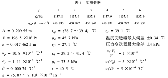 式中:qsi*i校准点在标准体积管处的实际流量,L/min;qsig*i校准点在标准体积管处名义流量的平均值,L/min;D标准体积管的内径,mm;E标准体积管材料的弹性模量,Pa;e标准体积管的壁厚,mm;psi*i校准点在标准体积管处的流体表压力的平均值,Pa;αp标准体积管的线膨胀数,℃^-1;tsi*i校准点在标准体积管处的流体温度的平均值,℃;αr体积管测量杆的线膨胀系数,℃^-1;tri*i校准点在体积管测量杆处的温度,℃。