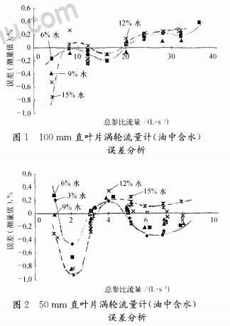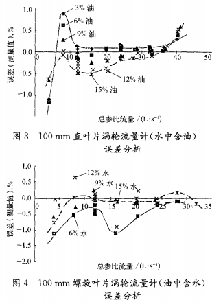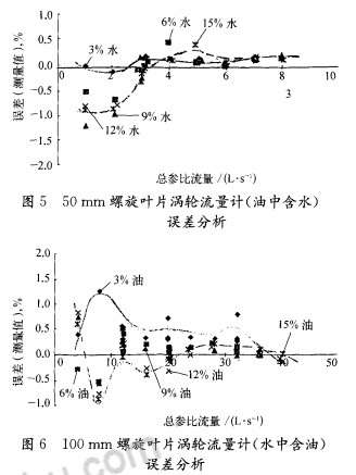 3)油中含水与水中含油两者误差变化的差异。涡轮流量计测量水中含油*二组分体积分数变化引起测量误差变化比油中含水大。