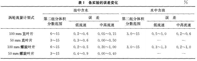 油水混合液在水平管道内静止时油和水是分层的;在开始流动或很低流速时处于油水两层的分层流;随着流速增加油水逐渐混合,流速愈大两相混合愈均匀;当进入涡轮叶片转动时两相混合将更为均匀。因此,混合液两相均匀程度是影响测量误差的因素之一。