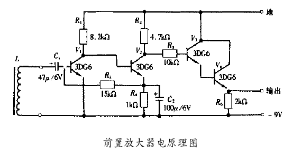 当被测介质(液体)通过变送器时,推动涡轮旋转,由于螺旋状的涡轮是由导磁材料制成,所以旋转后会周期性地增减线圈的磁通量,通过线圈感应出频率与流量成正比的脉冲电信号。此电信号较弱(约20mV~500mV),需经前置大器放大(放大倍数约为,400左右)后,再送给流量指示、累积仪表处理。变送器由机械装置(涡轮、导流件、壳体等)和电子装置(前置放大器)组成。前置放大器安装在壳体上部,两装置之间通过螺纹连接。前置放大器的电原理如下图所示,共由四级电路组成,前两级是电压放大,后两级是射*组合输出。