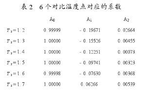 Z值可根据通用曲线图确定或利用状态方程算出。为计算方便,多采用对曲线进行二次拟合的方法来近似求得Z值。在求解Z值的时候,在所研究的对比温度的范围内选取了6个均匀分布于研究范围内的Tr点为参照点(见表2),得到Z与Pr之间的简单函数关系。通过数据分析,利用*小二乘法对曲线进行拟合,得到Z求值公式如下: