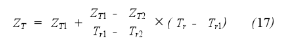 当温度为T1时,对比温度为Tr1,压缩系数为ZT1;当温度为T2时,对比温度为Tr2,压缩系数为ZT2;实际气体测量中,气体组分的变化一般不会太大,因此设Tm、Pm值不变。若温度为T,T1<T<T2,利用线性插值可算出测量点的压缩系数ZT: