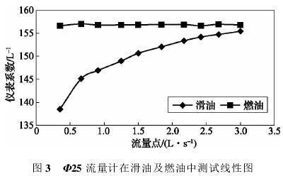 依据表3测试数据,经计算可得,Φ25流量计在滑油及燃油中测试结果如表4所示,测试线形图如图3所示。