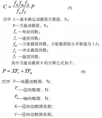 将选型轴承的参数代入(5)、(6)中直接得出基本额定动载荷C,而选型轴承的动载荷Cr 必须大于基本额定动载荷C 才能满足设计要求。