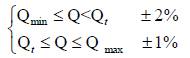 由图2 可见,仪表系数可分为二段,即线性段和非线性段。在非线性段, 实际特性受轴承摩擦力、流体粘性阻力影响较大。当流量低于Qmin 时,仪表系数随着流量迅速变化。压力损失与流量的平方成正比关系。通常线性段约为工作段的2/3,其特性与涡轮结构参数及流体粘性有关。随流量的变化其仪表系数K 也会有一定的变化,但变化不大,通常将其变化幅度称为流量计的计量准确度。对于产品设计而言,期望能将线性段的流量范围拓展,一台流量计能覆盖同口径的不同流量范围,使得产品量程比变宽从而降低生产管理与生产批量加工成本。对于1.0 级的高压智能一体化桃色视频入口,以Qt(0.2Qmax)为分界流量点,将计量线性分为两段,其中一段的*大允许误差为±2%,而另一段的*大允许误差为±1% 。按图2 所示,通常每台涡轮流量计均有较为相似特性曲线,若将可测量流量范围做宽,就能在同口径不同流量范围进行分段截取,以实现一台流量计能覆盖同口径的不同流量范围。