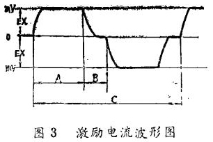 (1)激励电流的波形检查。在激励电流检查端EX+和EX一之间连接一个电阻(IΩ士0.1%),这个电阻与激励线圈串联,示波器输入端并联在电阻上。若波形起伏很大时,则不正常。波形正,负方向对称,A一C测量周期值在规定的范围内则为正常,其波形如图3所示。