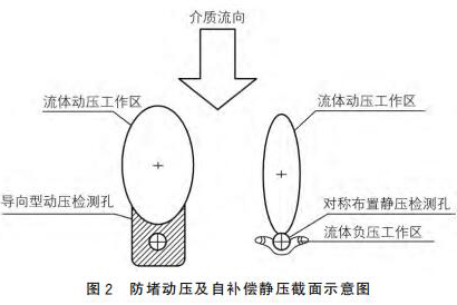 新智能液体涡轮流量表采用抛物面导向型结构作为动压测点,采用对称自补偿型式的静压测点,可以有效地解决来流方向偏流时信号的稳定采集,来流偏离管道轴线时,可以维持输出差压基本不变,如图2所示。