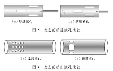 防砂卡重油流量计量表结构如图1所示,主要由重油流量计量表、筛状出液孔、重油流量计量表安装短接、解卡管、解卡管开槽、中心管、长条孔(销钉运动槽7)、薄壁筒、进液孔、解卡管固定销钉、含水传感器安装筒组成。采用等效面法,将进液孔一分为二,改为宽2mm的矩形进液孔,解决从进液孔进入的长垢片或大垢片造成的砂卡,如图2所示。将原先3个方型的出液孔改为直径4mm的阵列状的筛孔,解决仪器在下井过程中从出液孔进入仪器的长垢片、大垢片造成的砂卡,如图3所示。