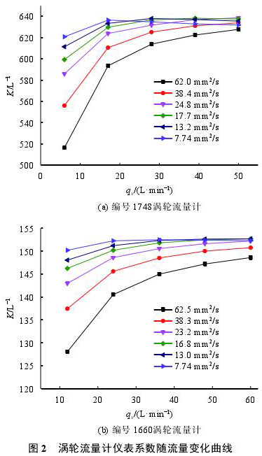 研究利用航空润滑油流量标准装置在20,30,40,50,60,80℃对10支成品油计量表进行校准试验。CL-10型流量计校准流量点分别为6,17,28,39,50L/min;CL-15型流量计校准流量点分别为12,24,36,48,60L/min。图2是1748和1660两支成品油计量表在各粘度点仪表系数随流量变化曲线。