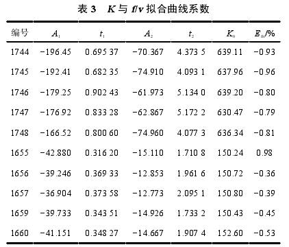 利用双指数衰减函数对仪表系数与雷诺数关系进行拟合,在层流范围内(Re<2300),仪表系数随Re增加迅速增加,尤其是在Re<1000范围内更加明显;而在Re>3000紊流范围内,仪表系数变化平缓,接近常数;在1000