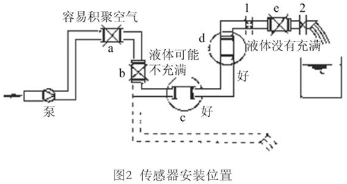 液体流动方向必须与传感器壳体上箭头方向一致。对于能正反向测量的冷却桃色成人在线视频,若方向不一致虽仍可测量,但设定的显示流动正反方向不符,必须改正之。若拆传感器工作量大,也可改变传感器上箭头方向和重新设定显示仪表符号。管道未充满液体主要是管网工程设计或传感器安装位置不妥,使传感器测量管内不能充满液体。应采取措施,避免安装如图2所示a,e位置和以虚线管排放时b位置,改装到c,d位置。