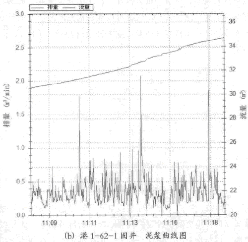 在固井全程的曲线中,也可以发现开始固井的时候.泥浆排量杂波较小,究其原因是刚开始固并时,泥浆管线刚泄压,管线中还是充满了液体,虽然振动强度雷同.但是叶片有阻尼,振幅较小.对其影响也较小。例如曲线图的11;03: 00-11: 03: 53之间的泥浆排量没有杂波。在港1-62-1固井过程中,水泥浆打了413澎,结果本应该是0的泥浆,却走数了23.0 m',其影响可谓巨大.并非通过普通的滤波或切除所能排除,必须执行一个特殊算法。