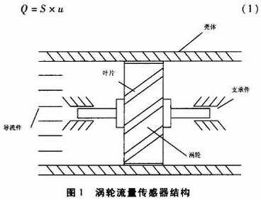 涡轮流量传感器输出的脉冲信号频率F=Nxn(N是涡轮叶片数,n是涡轮的旋转速度);流过涡轮流量传感器的被测流体体积流量Q=Sxu(S是流体的流通截面积,u流体介质的流速);涡轮流量