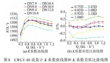 从K系数曲线图中可以看出,不同直管段口径会影响仪表K系数,但是与仪表本身K系数的变化趋势一致。