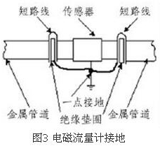 (4)尽量避开振动源、磁源(大功率电机、变压器)由于树脂计量表的测量感应电压很小,电压较低,易受外界电磁噪声的影响,故在安装时应进行可靠的接地连(跨)接。金属管道树脂计量表接地连(跨)接方法如图3所示