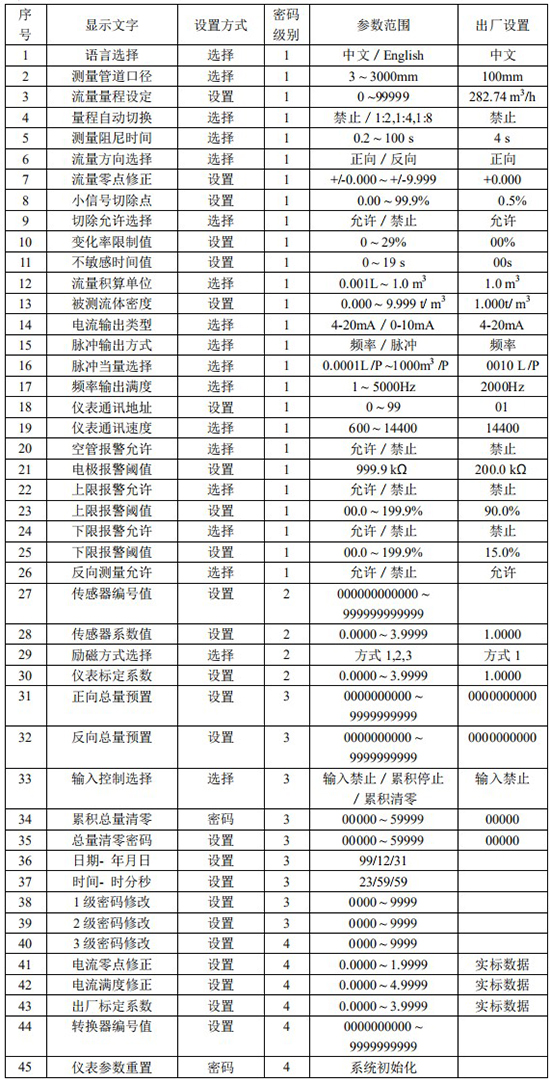 仪表参数设置功能设有 5 级密码。其中,0~3 级为用户密码,* 4 级为制造厂密码。用户可使用* 4 级密码来重新设置* 1~3 级密码。另外,还设有总量清零密码专门用于累计计数回零。