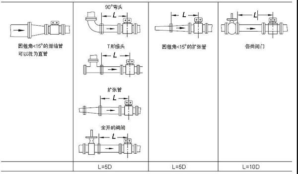 所以在有些流速偏低工况下,为了使污泥流量计工作在合适的流速范围,允许有一定的压力损失时,可以选择流量计传感器的口径小于管道口径,在仪表前后增加异径管,提高介质流速。异径管的中心锥角α不大于15°,可以视为直管,如图5。