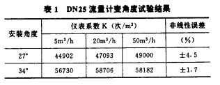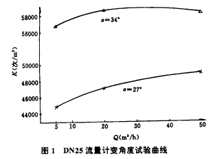 对DN25流量计分别做了叶片安装角a为27°和34°的变角度试验,其结果见表1和图1。