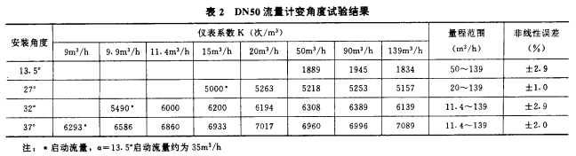 对DN50流量计分别做了a为13.5°、27°、32°和37°变角度试验,其结果见表2和图2。