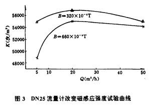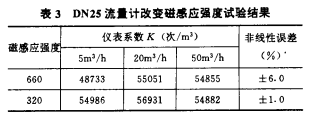 位于流量计之上,紧贴壳体处安装着磁电转换器,它将对涡轮叶片(由铁磁性材料制成)产生一个恒定的磁性阻力矩。无论叶片处在静止或转动过程中都将始终受到这一磁力作用。这一磁力将直接影响着流量计的性能,尤其小流量时影响更大。为了研究该磁力对流量计性能的影响情况,桃色APP直播软件选取适当的磁感应强度,对同一台DN25流量计进行了变磁感应强度B的影响试验,其试验结果见表3和图3。
