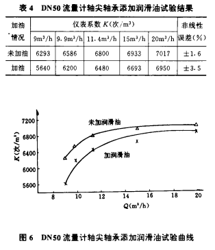 通过试验表明,润滑油对流量计小流量的性能的影响较大,随着流量的增大,两条曲线之间的差值逐渐减小。由于轴尖和轴承的摩擦阻力很小,并且采用硬质合金材料制成,耐磨性很强,故建议流量计在出厂标定前可以不必加入润滑油。